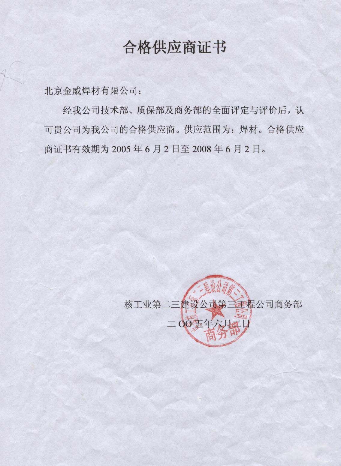 核工业第二三建设公司第三工程公司合格供应商证书