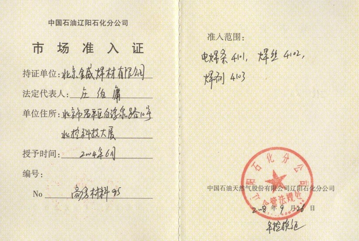 中国石油辽阳石化分公司市场准入证