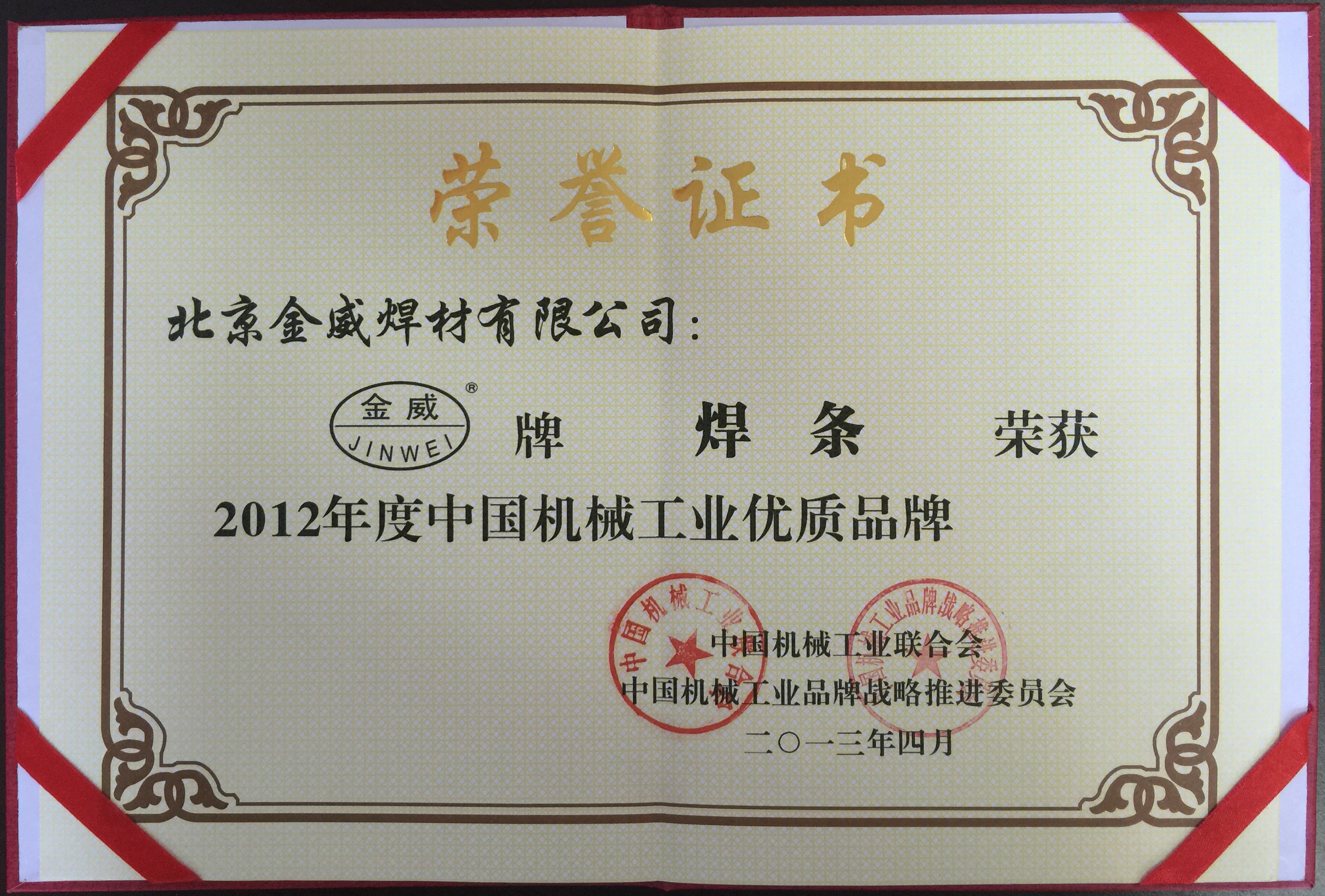 中国机械工业优质品牌证书