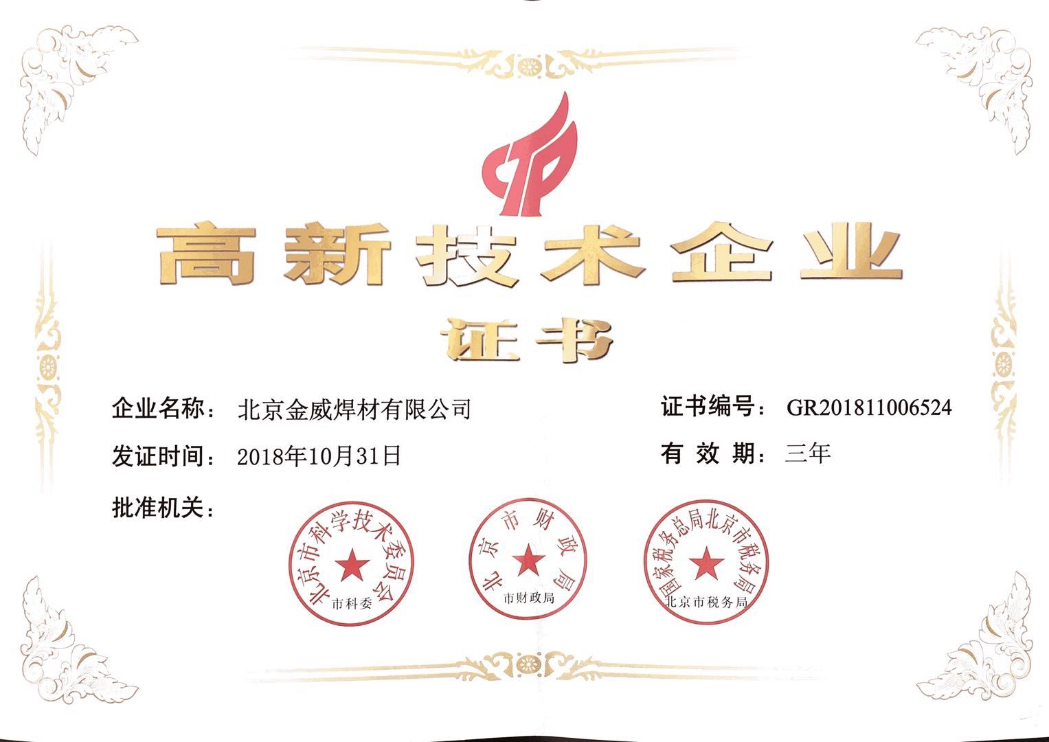 高新技术企业证书