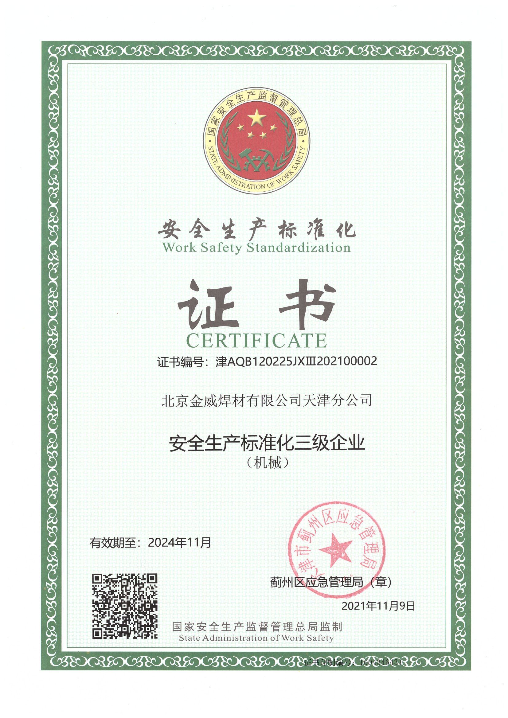 安全生产标准化三级企业证书