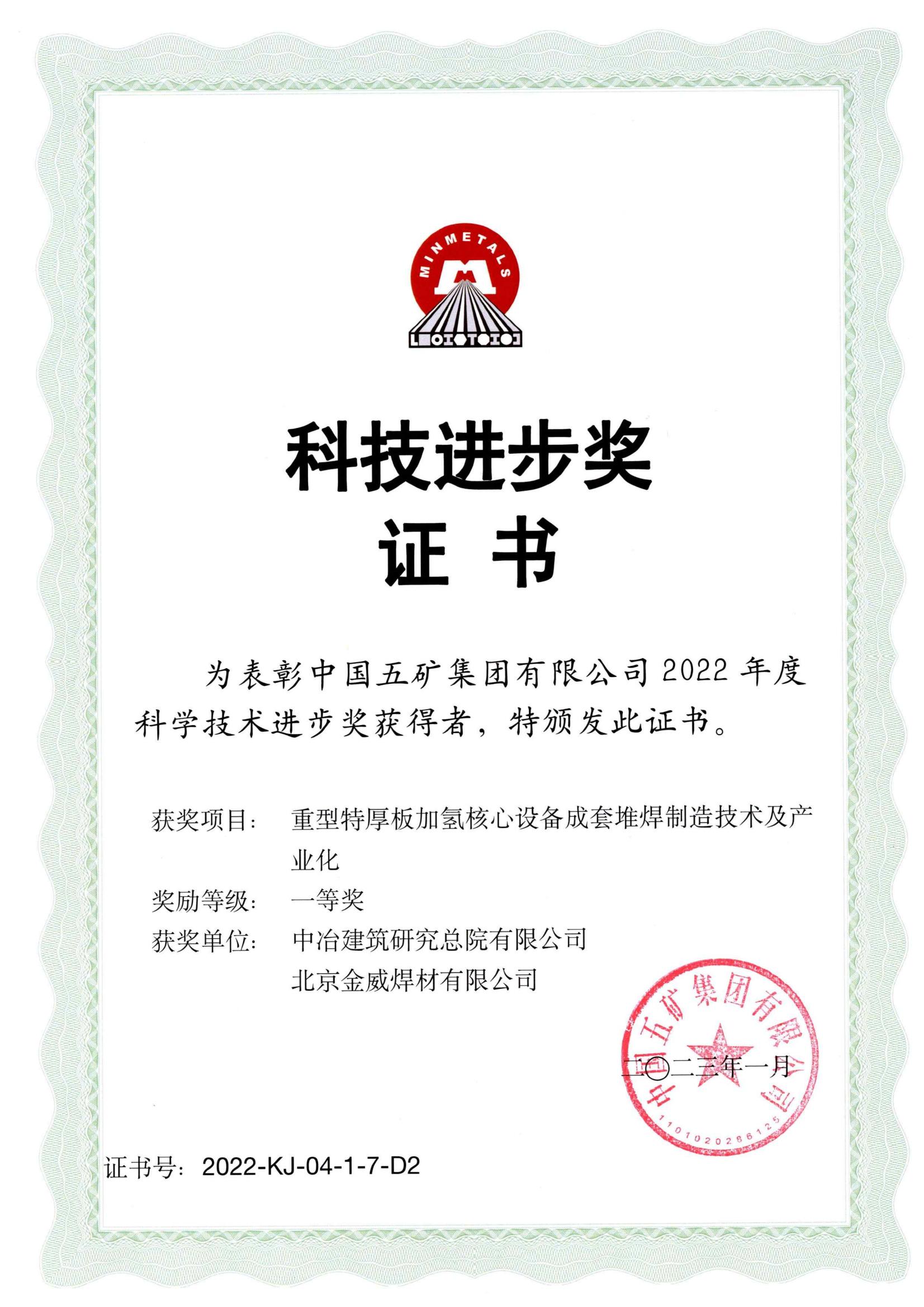 五矿集团科技进步一等奖
