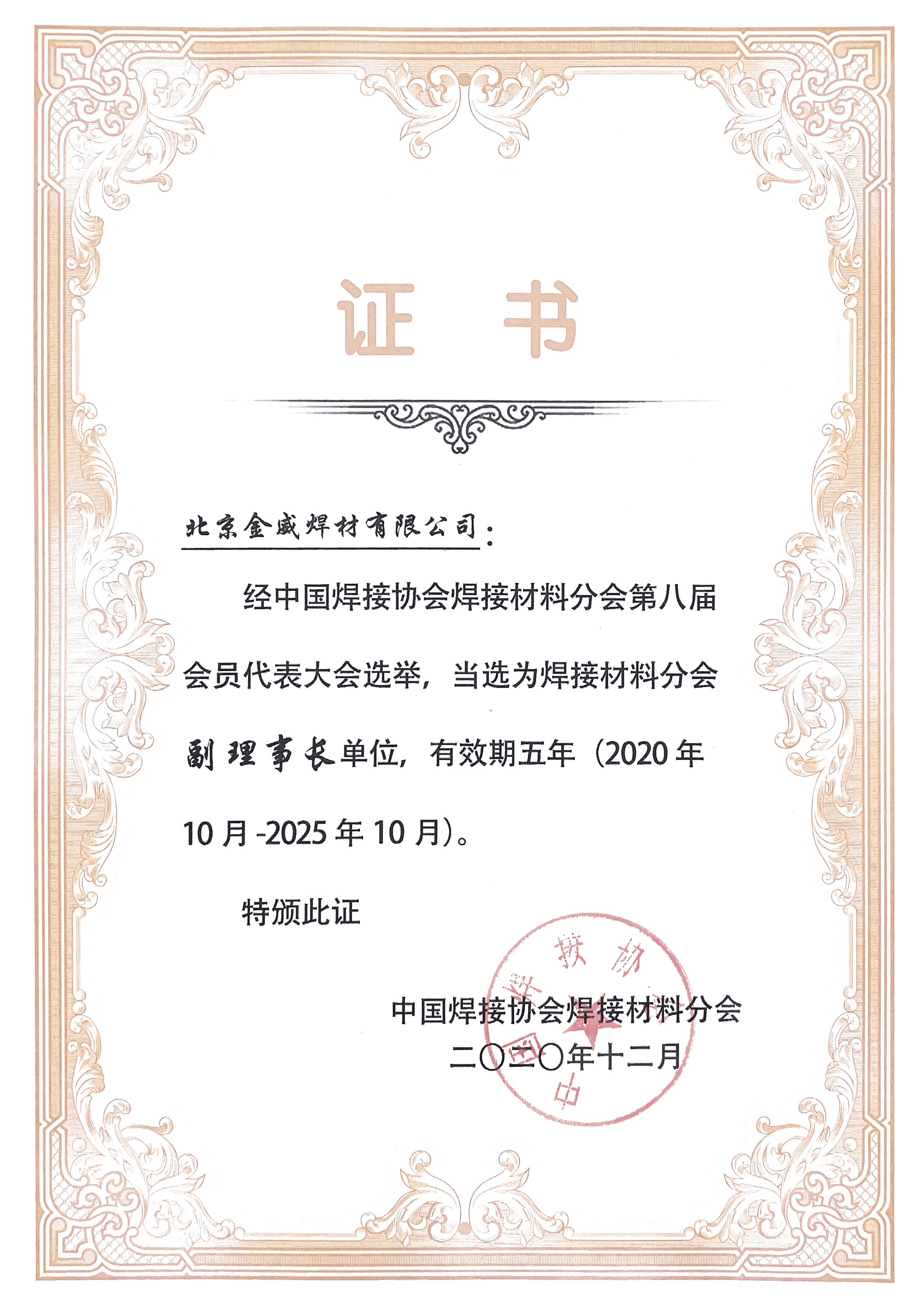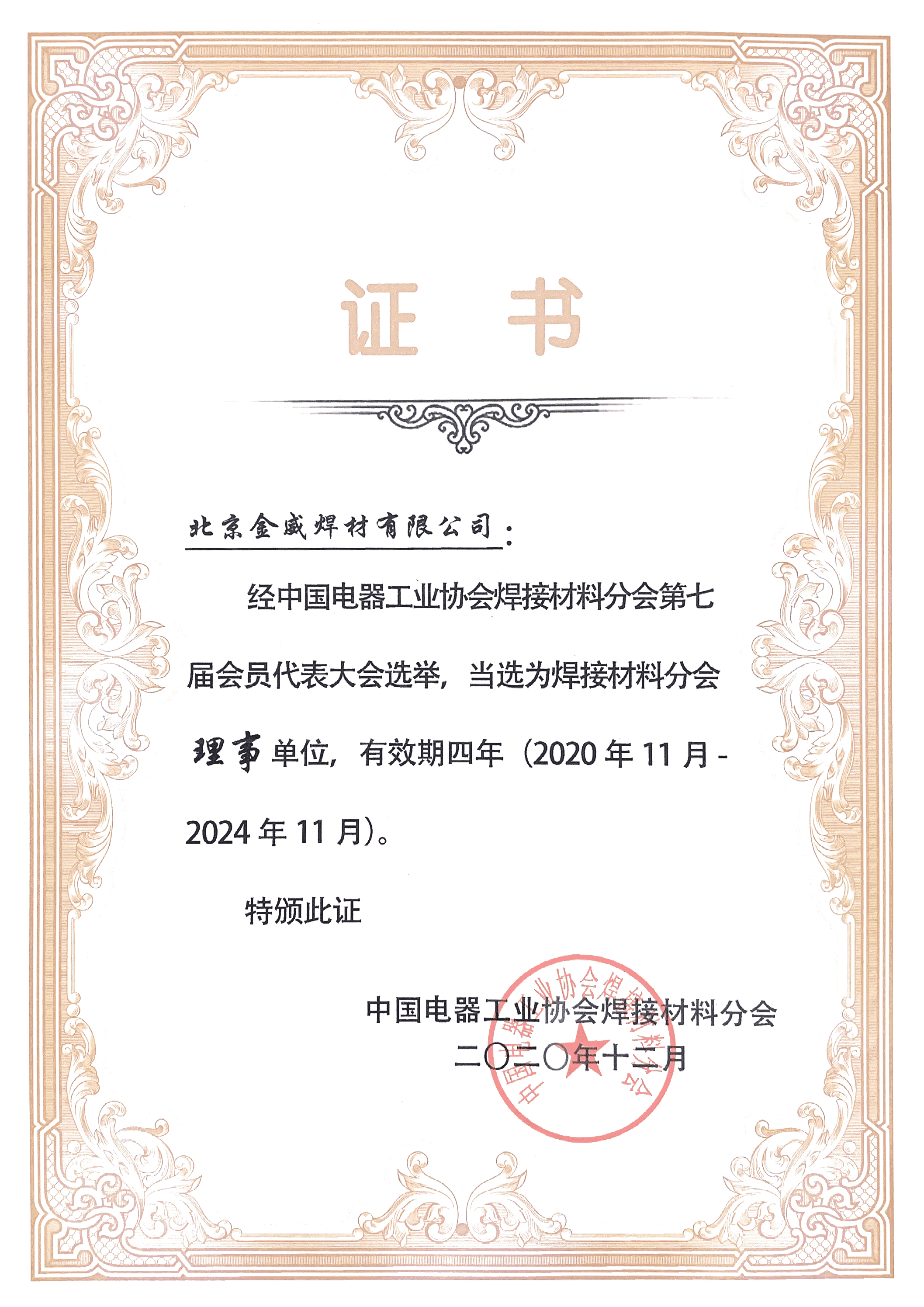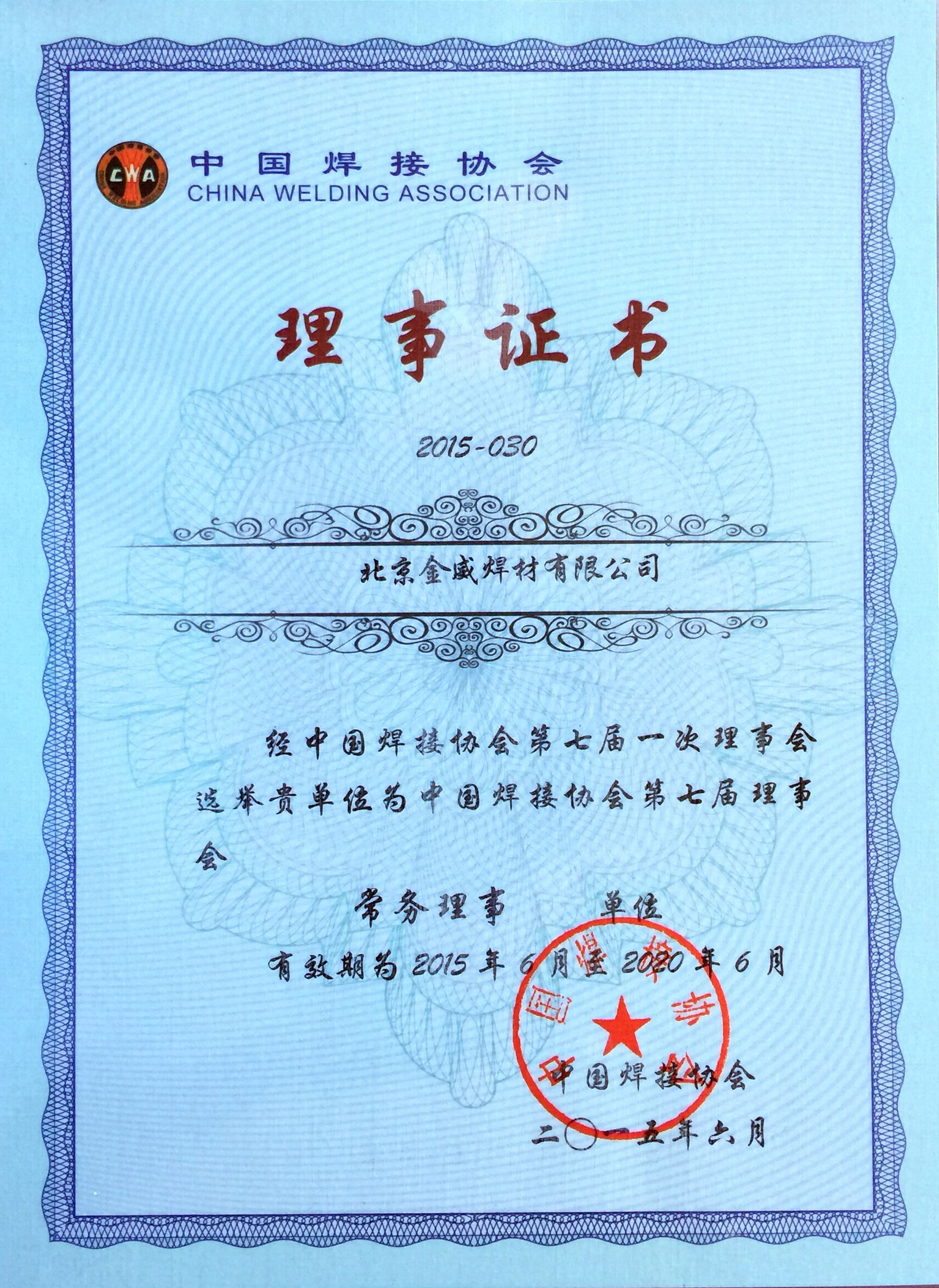 中国焊接协会常务理事单位证书