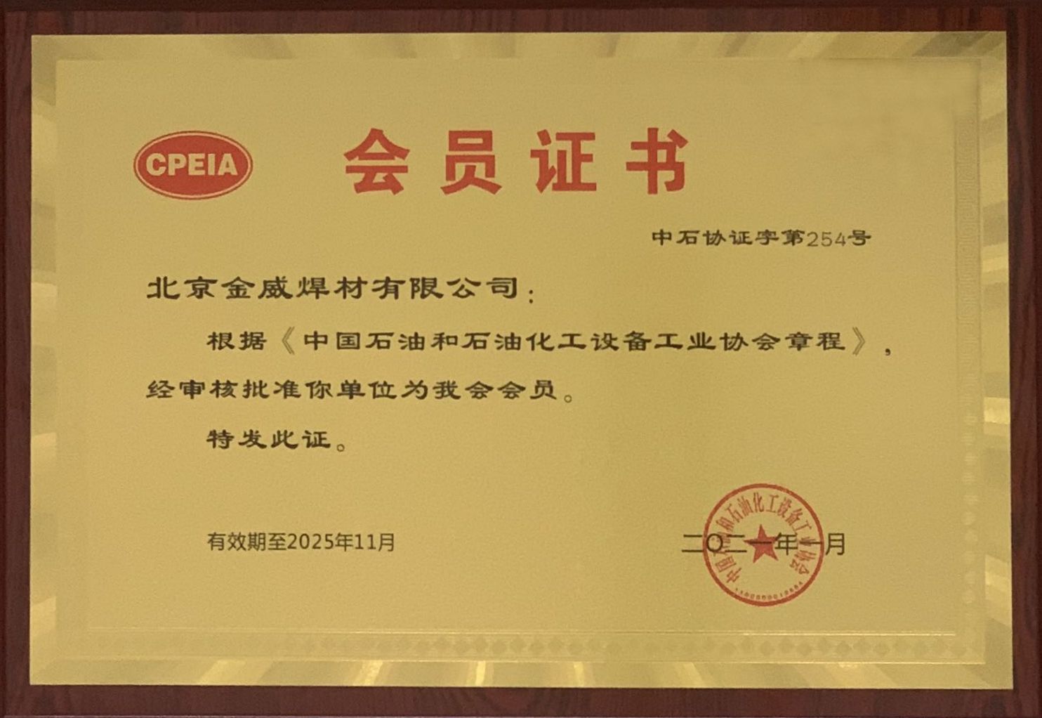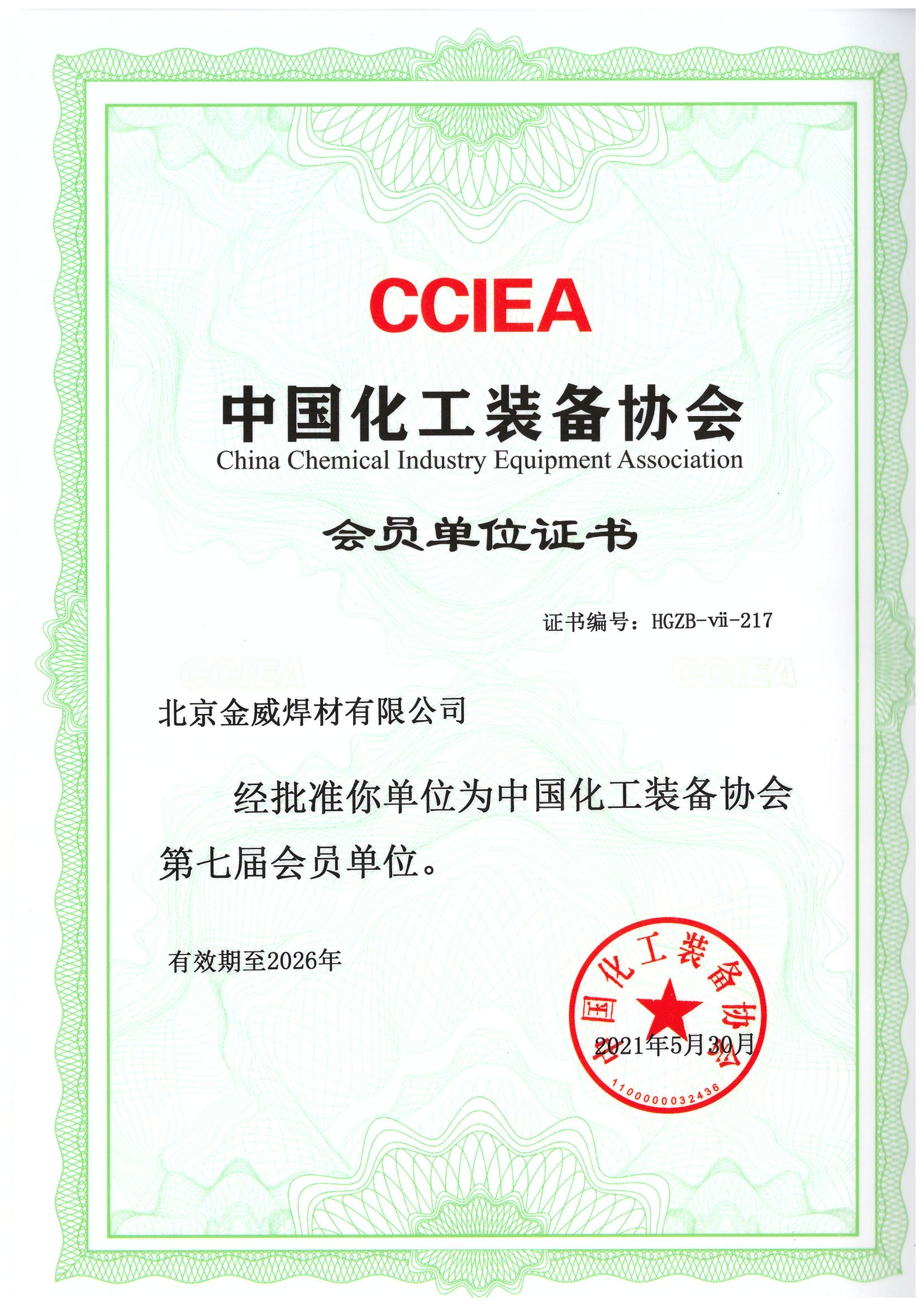 中国化工装备协会会员单位证书