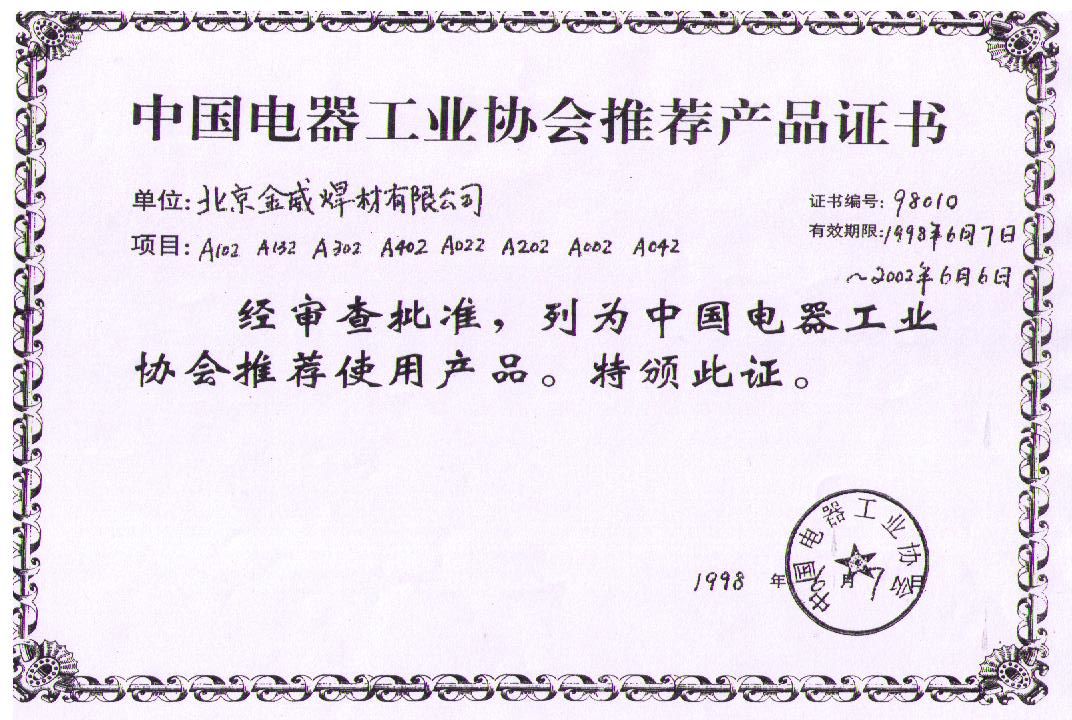 中国电器工业协会推荐产品证书